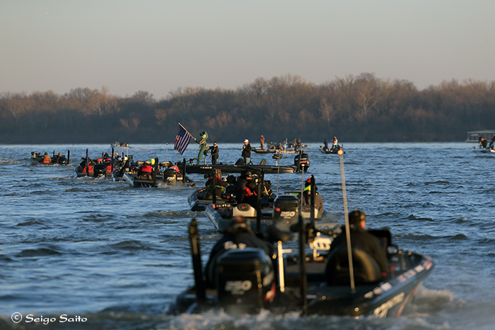 バスマスタークラシック2日目のスタート 1人づつコールされて一列で出て行く様は いつ見ても格好いいなと思います 本日も地元のジェイソン・クリスティ選手が 2位とのウエイト差を広げての首位 後は明日最終日を残すだけです 明日はジェイソン選手を半日追いかけます