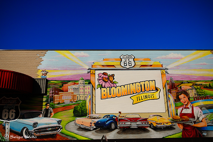 ルート66の街にしてはなかなかのサイズの ブルーミングトンはシカゴからは約100キロ イリノイ州ルート66の街には多くの壁画が描かれている