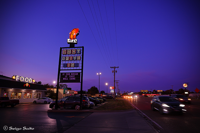 Cozy Dog Drive In アメリカンドッグの老舗 初めて訪れたコーズィードッグ 初めて訪れた際は他でサンセットを 撮影していて到着した頃には空は真っ暗 なので翌日いい時間帯に再訪して撮影 思った感じの色になりました