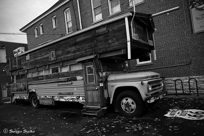 ルート66のアーティストといえば 故ボブ・ウォルドマイアーさん このスクールバス(改)と VWバスでルート66のアートを描き続けた 今はイリノイ州ポンティアックの ルート66博物館に所蔵