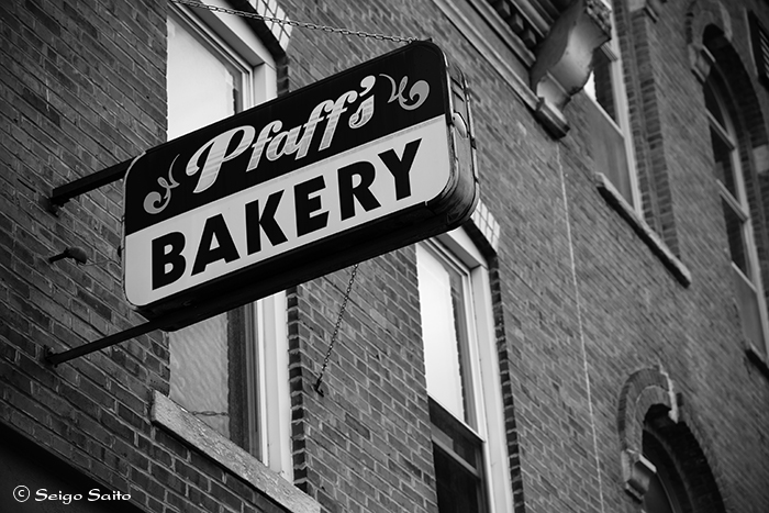 イリノイ州ポンティアックの Pfaff’s パン屋さんのサイン レンガ作りの建物の一角 シンプルなそれがマッチしている