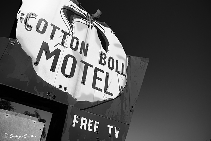 オクラホマ州カヌートの街にある Cotton Boll Motelのネオンサイン ネオン管はすでにほぼ全部取れてしまって ネオンサインとしては機能していないけれど 昔ながらのモーテルサインとして偏在 テレビが無料で見れるのが売りだった時代 いつの日は誰か治すのかなぁ