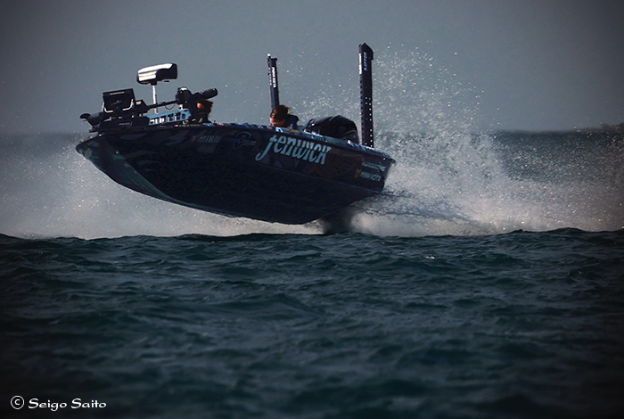 バスマスターエリートセントクレア戦 ルーキーのエミル・ワグナー選手が 荒れている湖を走り抜ける ボートは完全に波の上を飛んでる