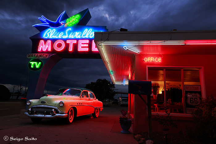 アルバカーキの熱気球祭りを後にして 昨晩はトゥクムカリの街まで ルート66でかなり人気のネオンサイン ブルースワローモーテル 夕方から天気が崩れお空には黒い雲が それはそれで画になるな