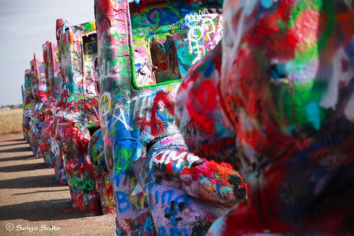 キャディラックランチは訪れる人が スプレーで落書きをしていくので 毎回違うキャディラックに出会うことになる 一度は元の色にしたことがあるらしいが 24時間以内に再びキャンバスと化した