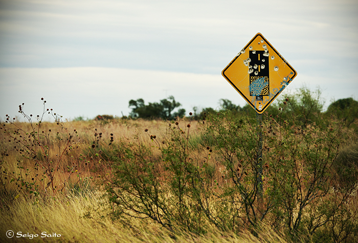 ニューメキシコ州側のグレンリオ 振り向いたらなんか道路標識が穴だらけ 銃弾だよなぁ きっと