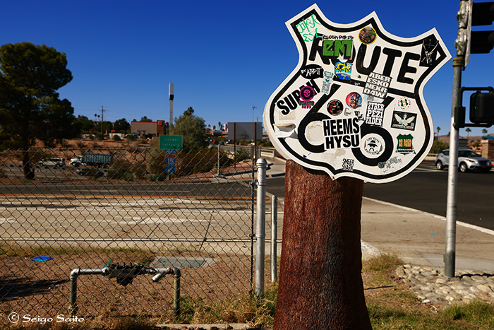 カリフォルニア州バーストー 高速道路を降りると見えた ルート66のシールド ガソリンスタンドにお邪魔してパチリ この裏側はさらにシールだらけだった